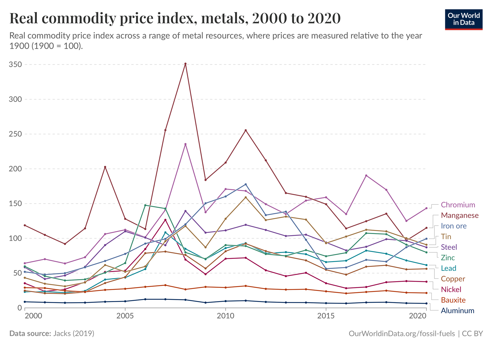 Commodity prices and resource rents tell a story of stasis. In the years leading up to circularity’s mainstream debut, both price levels and volatility appeared to be trending upward across a wide range of materials. That context made the economic case for circularity feel urgent and intuitive. Since then, however, those trends have not persisted in aggregate.